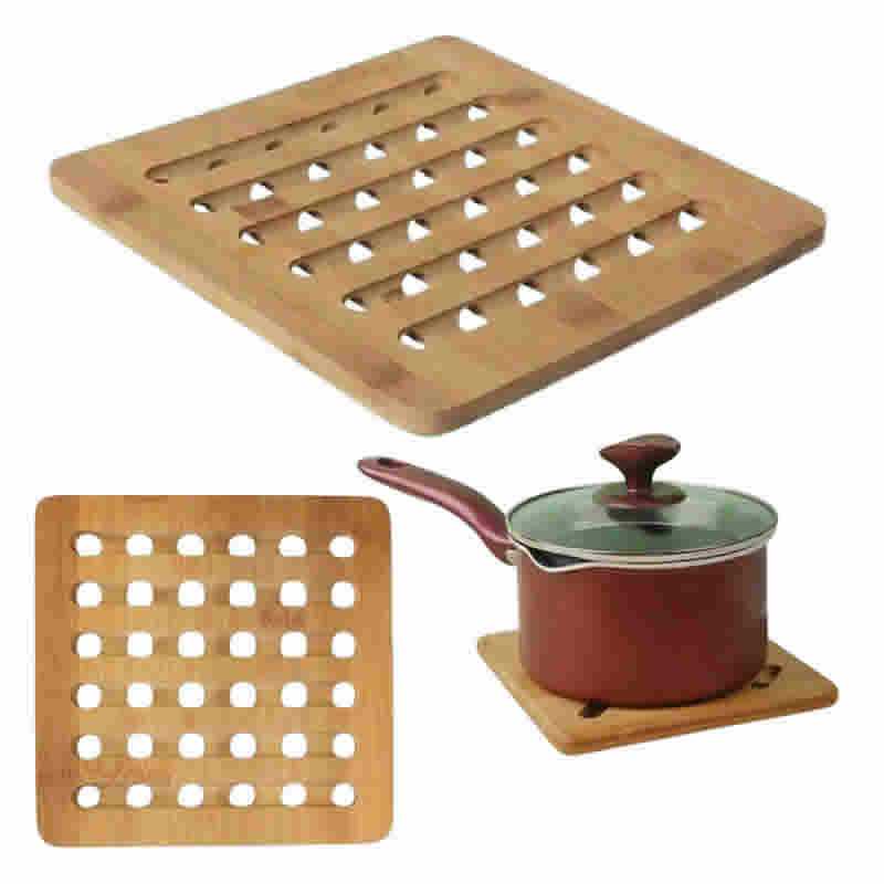 Tato čtvercová podložka o rozměrech 18x18x1,2 cm je vyrobena z odolného bambusového dřeva a představuje ideální oporu pro horké hrnce, talíře či plechy na stole nebo kuchyňské lince.