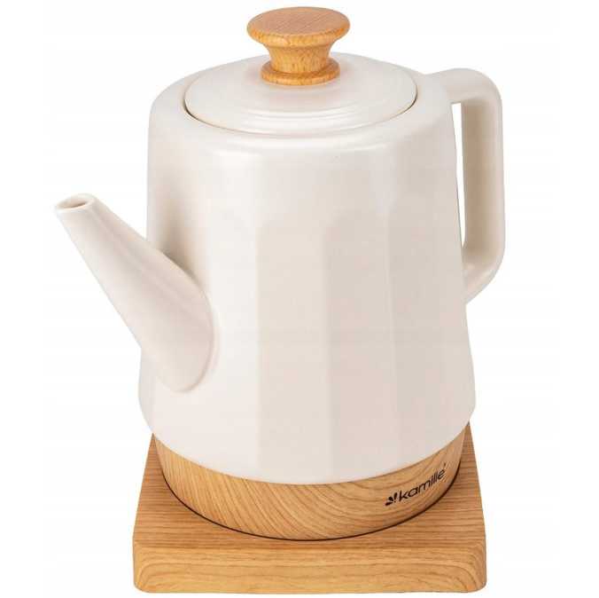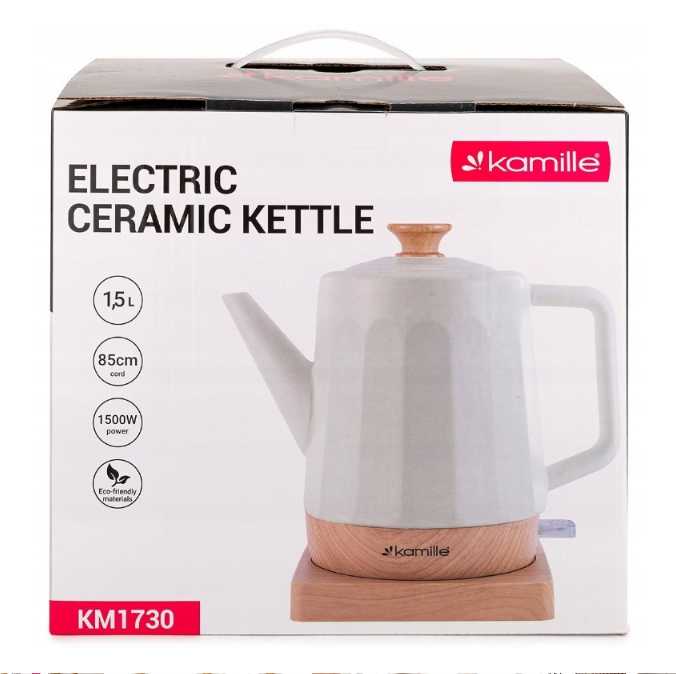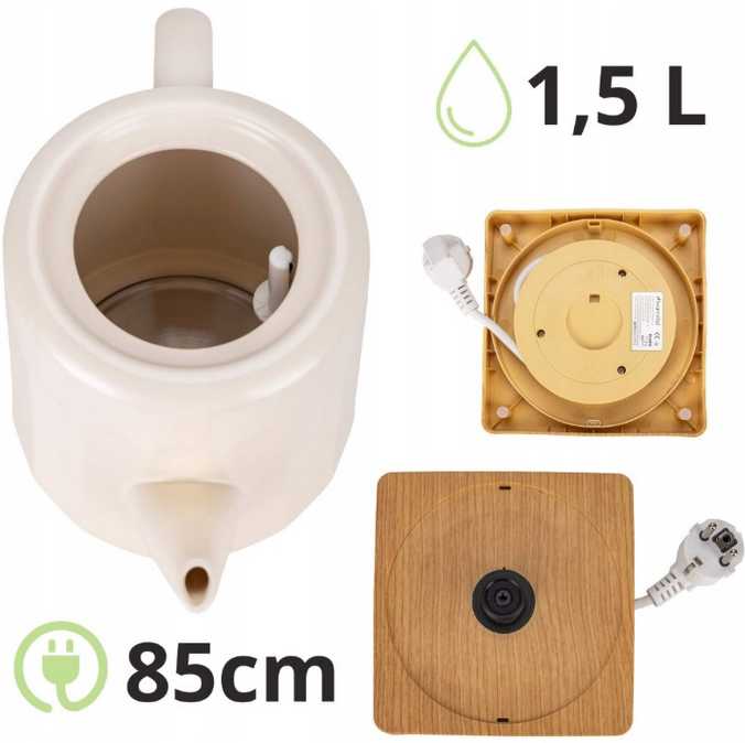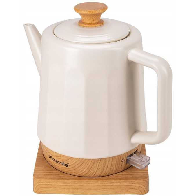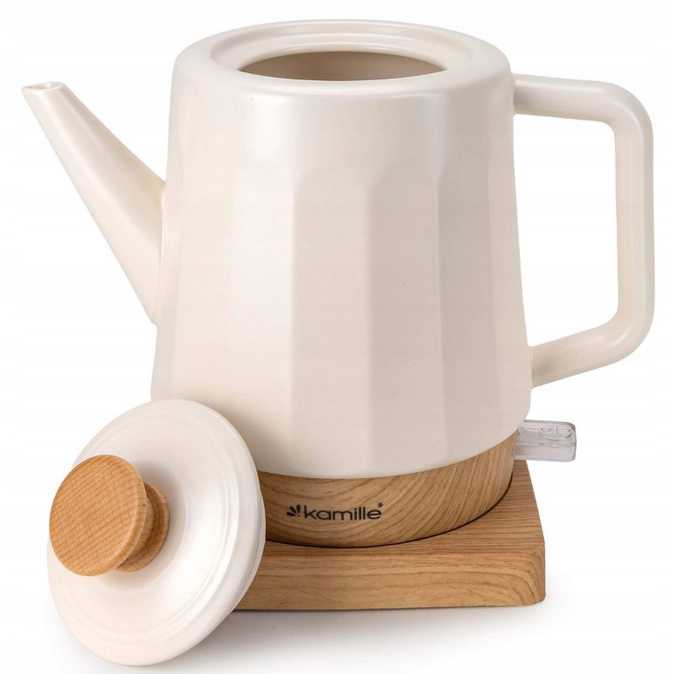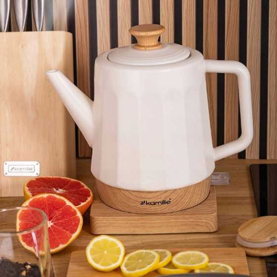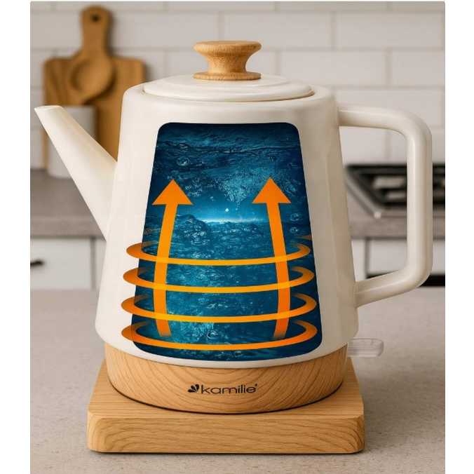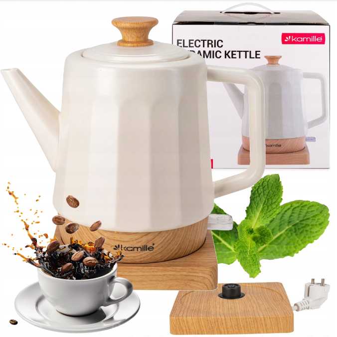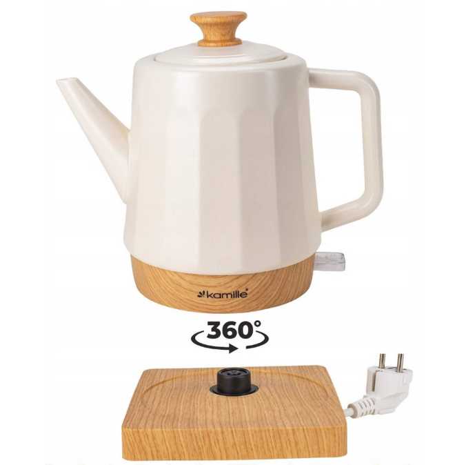 Keramická konvice Kamille je vynikající kombinací klasického designu a moderních řešení. Vyrobená z vysoce kvalitní keramiky, zaujme svou estetikou a zároveň se stará o přirozenou chuť vody – bez nežádoucích pachů nebo pachuti plastu. Díky výkonu 1200 W rychle uvaříte až 1,5 litru čaje . Bezdrátová konstrukce a 360° otočná základna zajišťují pohodlné používání a ergonomická rukojeť činí používání konvice mimořádně pohodlným. Konvice Kamille je nejen praktickým zařízením, ale i ozdobou kuchyňské desky – ideální výběr pro lidi, kteří oceňují design a kvalitu při každodenním používání!