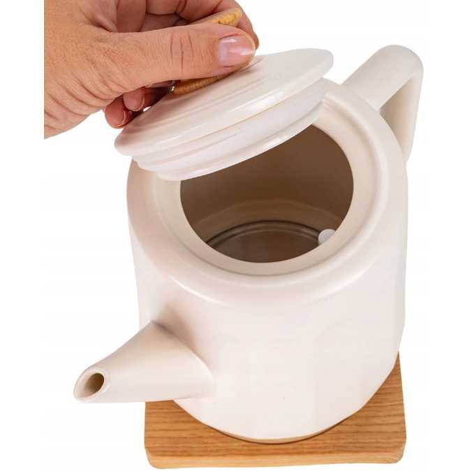 Korpus je vyroben z vysoce kvalitní keramiky v krémové barvě s geometrickými, jemně fasetovanými stěnami. Taková forma mu dodává jedinečný charakter a eleganci a zároveň zajišťuje trvanlivost a odolnost vůči vysokým teplotám. Podstava je dokončena ve stylu napodobujícím přírodní dřevo, čtvercová, což odlišuje tento model od tradičních konvic. Keramická poklice vybavená dřevěnou rukojetí v přírodním odstínu, která usnadňuje bezpečné odstranění a nasazení poklice. přípravu přelévané kávy nebo listových čajů. Ergonomická rukojeť – jednoduchá, masivní, keramická, která zajišťuje pevné a stabilní uchopení během nalévání. Vypínač s kontrolkou – přehledný, umístěný ve spodní části, umožňuje snadné spuštění zařízení a monitorování práce. zvedání. Sbaleno v estetickém a pěkném obalu, který je ideální jako dárek.
