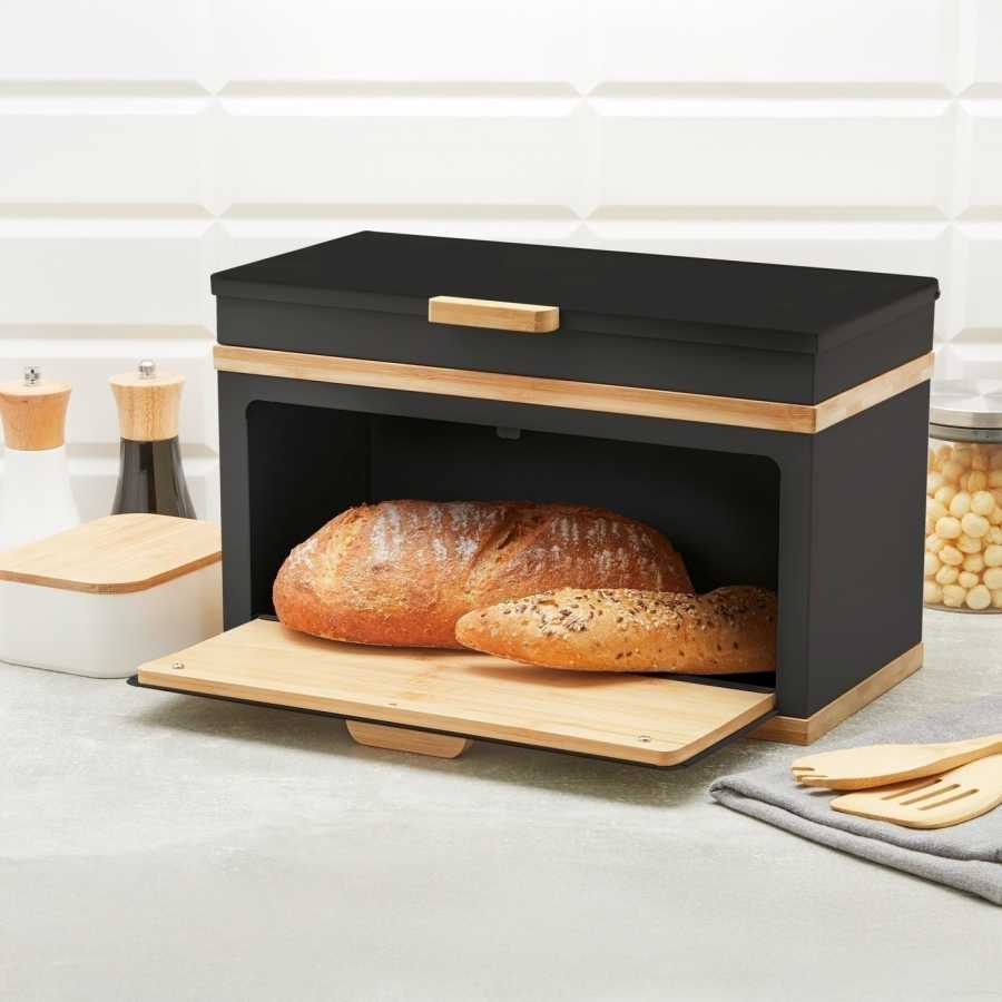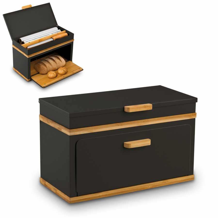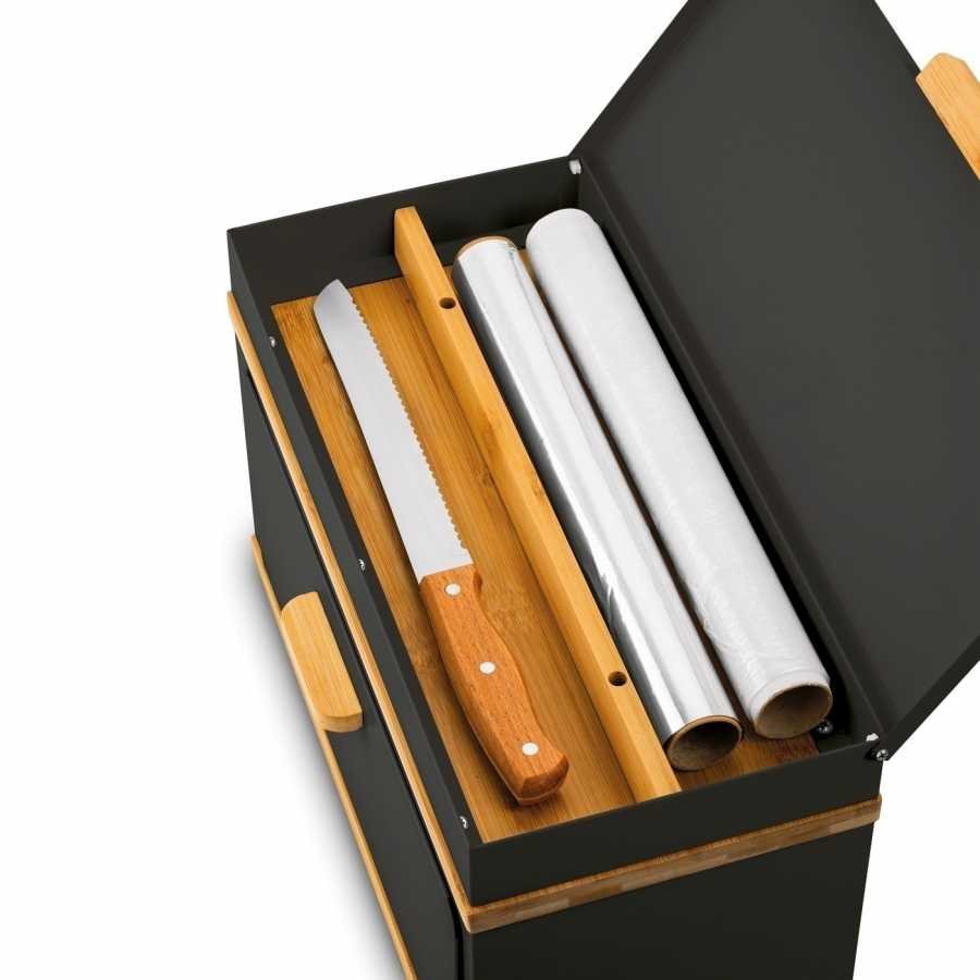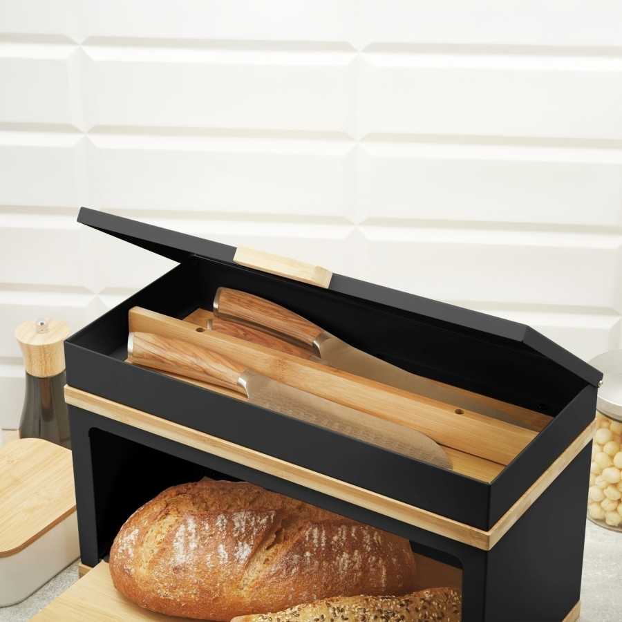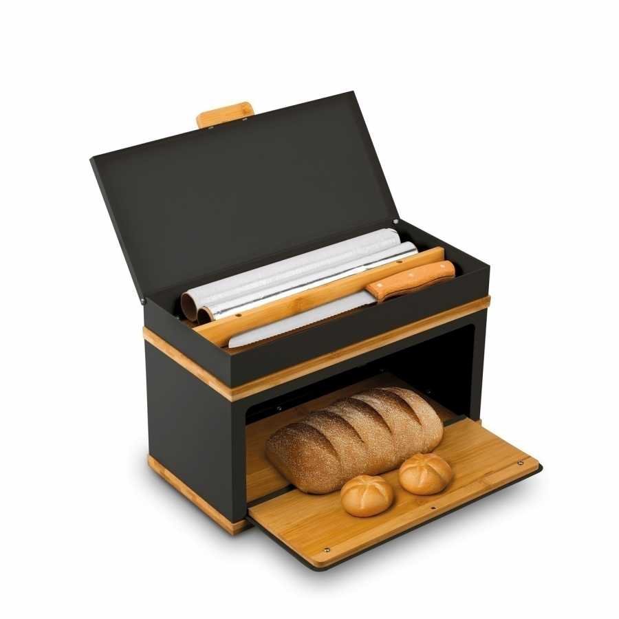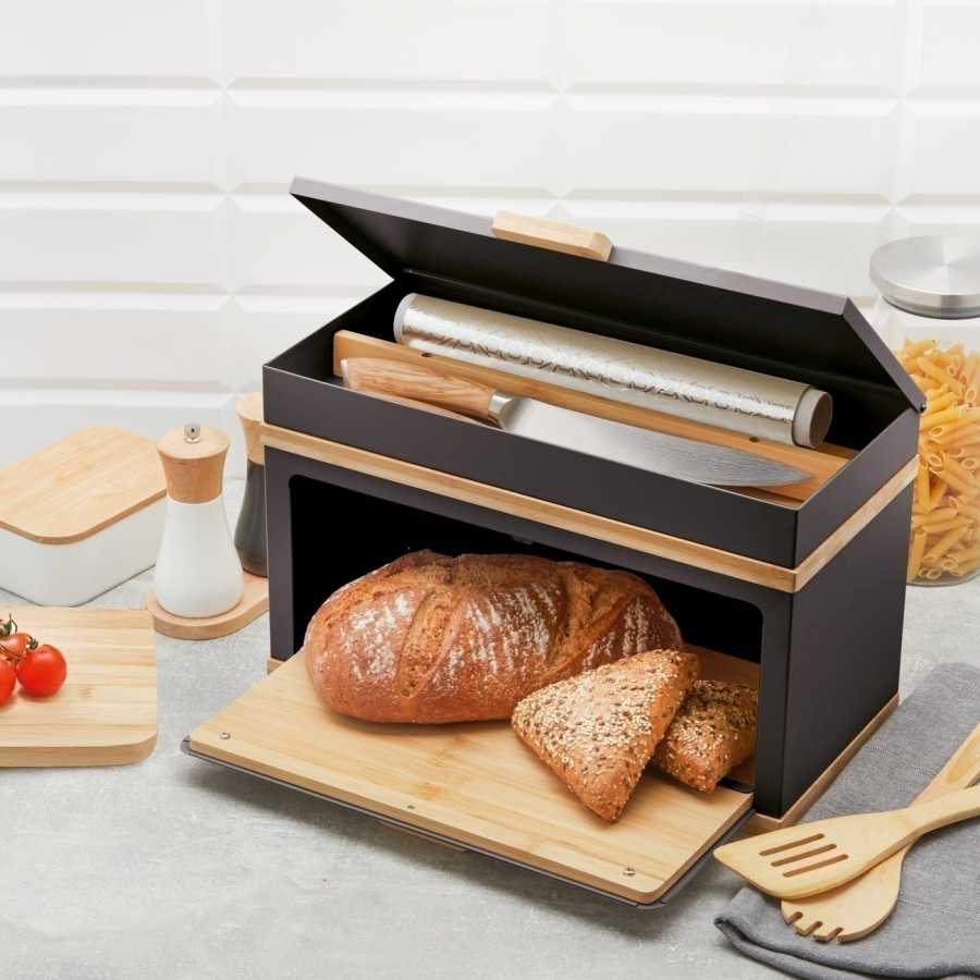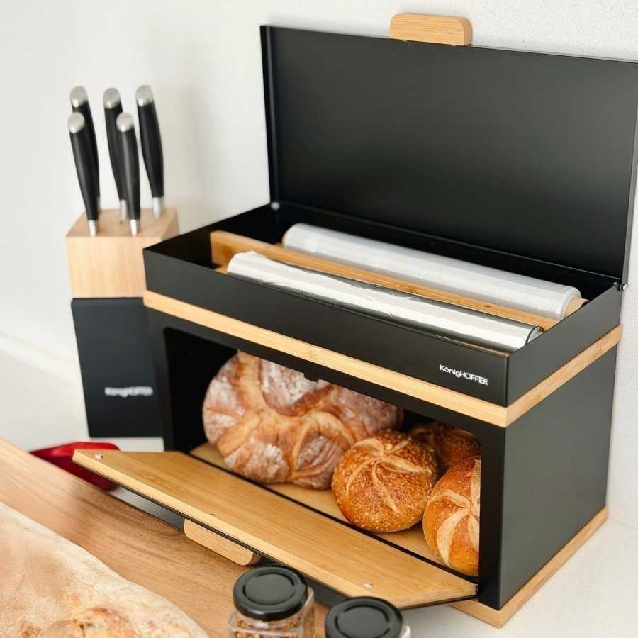 Praktický ocelovo-bambusový chlebník KonigHOFFER Artesano s krémovým povrchem chrání pečivo před vysycháním. Dodatečný úložný prostor v poklici na alobal či papírové utěrky udržuje pořádek na kuchyňské lince.