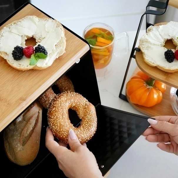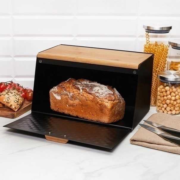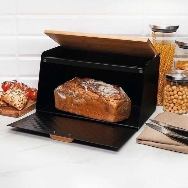Chlebník má bambusový potah, který se skvěle hodí ke krájení chleba, takže není potřeba další prkénko na krájení navíc. Bambusové dřevo je mimořádně odolné, ale zároveň je nejekologičtější surovinou na světě. Díky jedinečnému designu bude stylovým prvkem vybavení kuchyně. Hladké povrchy se snadno udržují v čistotě. Model má dvojité, výklopné - bambusové a kovové - uzavírání. Kryty dobře chrání obsah před znečištěním a světlem. Kov (uhlíková ocel) s práškovým nátěrem a bambusové prvky jsou velmi trvanlivé. Vejde se chléb a rohlíky pro celou rodinu. Je to návrh pro ty, kteří oceňují čerstvost, křupavost a aroma čerstvého pečiva a hledají pevný, kompaktní chlebník. Stabilně jej umístěte na kuchyňskou desku.