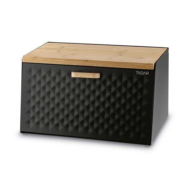Chlebník kovový s bambusovým víkem černý Geometric je moderní a zajistí, že pečivo zůstane déle čerstvé. Díky svému modernímu obdélníkovému tvaru geometrickou texturou a nadčasovou černou barvou se stane stylovým prvkem každé kuchyně.