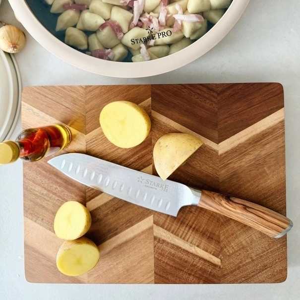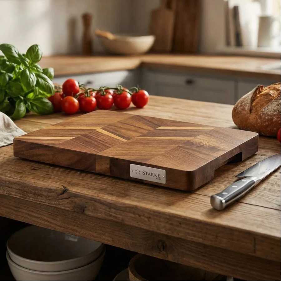 Toto hrubé prkénko na krájení s ABS nožičkami je vyrobeno z krásně strukturovaného akáciového dřeva. Je tvrdá, má sytou barvu a je ideální do náročných kuchyňských prostor. Díky impregnaci je toto prkénko na krájení trvale odolné vůči vlhkosti. Kromě toho, že slouží jako krájecí prkénko, lze jej povrch použít k servírování teplých nebo studených předkrmů.