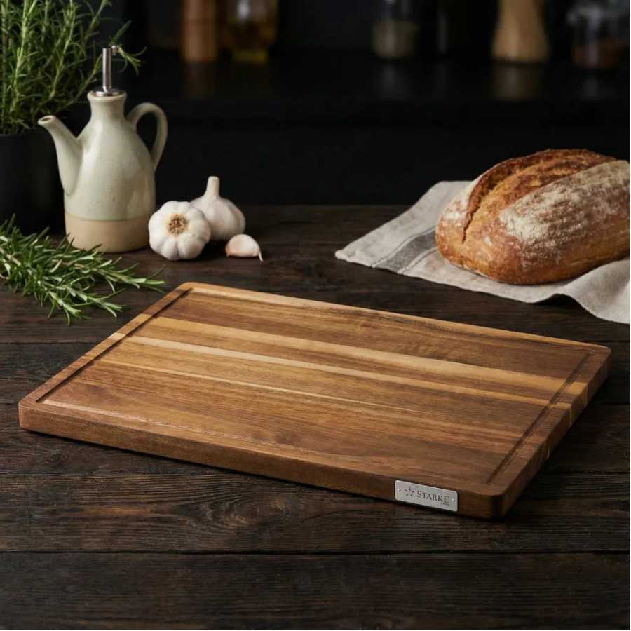 Velká dřevěná kuchyňská deska - hrubá na krájení a servírování s ABS nožičkami.Tato velká, tlustá deska na krájení je vyrobena z krásně strukturovaného akáciového dřeva. Je tvrdá, má sytou barvu a je ideální do náročných kuchyňských prostor. Díky impregnaci je toto prkénko na krájení trvale odolné vůči vlhkosti. Kromě toho, že slouží jako krájecí prkénko, lze jej obdélníkový povrch použít k servírování teplých nebo studených předkrmů.
