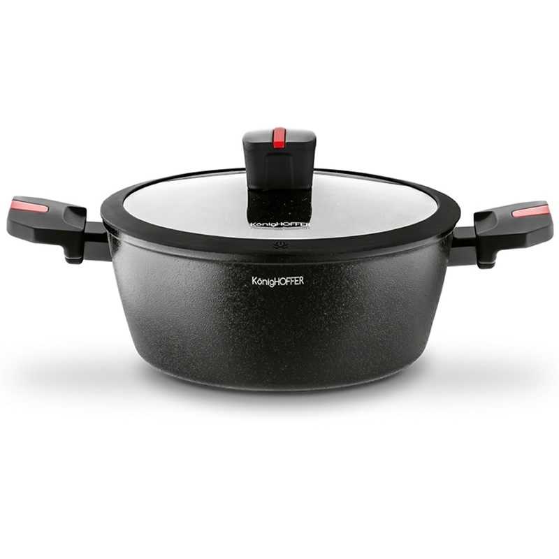 Hrnec granitový s poklicí Konighoffer Fegato, aluminiový hrnec s poklicí a nenahrievajúcimi se rukojeťmi soft touch. Hrnec granitový s poklicí Konighoffer Fegato ideální pro Vás nebo pro Vaše blízké jako dar. Nádoby Feagto mají třívrstvý povrch Greblon® C3 Granite. Povrch se skládá z podkladové vrstvy, která zajišťuje maximální odolnost na otěry - 4 hvězdičky - 8000 cyklů, keramické vrstvy, která zajišťuje tuhost povrchu s nejlepšími nepripaľujúcimi vlastnostmi s částečkami granitu (5 hvězdiček). To není pouze zárukou trvanlivosti a odolnosti, ale i jednoduché udržování v čistosti, nic se nepřipaluje a nelepí na povrch. Jídla tak jsou zdravější a chutnější.