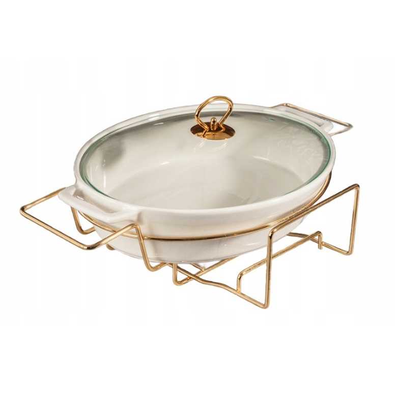 Ideální na zapékaná jídla, maso, zeleninu i jídla z jednoho hrnce. Ohřívač - zlatý podstavec, do kterého je možné umístit svíčky nebo lihové svíce, díky čemuž si jídlo déle udrží svou teplotu. Design - hladký povrch, snadná údržba a univerzální vzhled vhodný ke každé vzhled vhodný ke každé stolní soupravě.Využití-do trouby, na stůl i do bufetu.Je ideální k servírování teplých jídel bez obav z jejich vychladnutí. Skvěle se hodí pro svátky, oslavy i každodenní stolování, přičemž zajistí pohodlí i estetické podání.