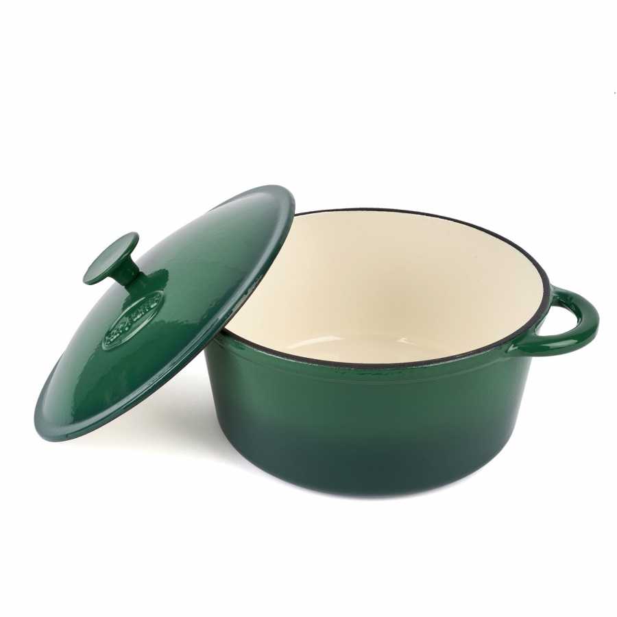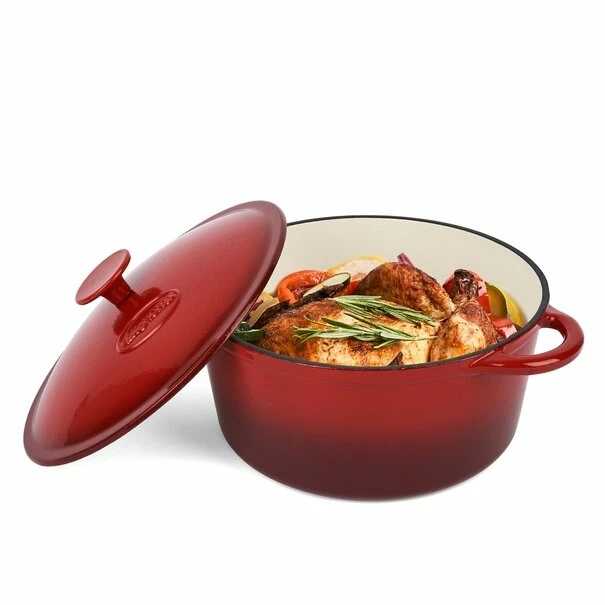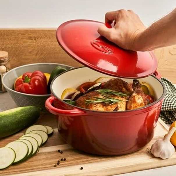 Litinový pekáč ideální pro pečení, dušení a smažení jídel. Výrobek je vyroben z vysoce kvalitní litiny potažené smaltem zevnitř i zvenčí. Vnitřní interiér v krémové barvě. Vnější červená úprava. Litinový pekáč se vyznačuje smaltovanými držadly a víkem.