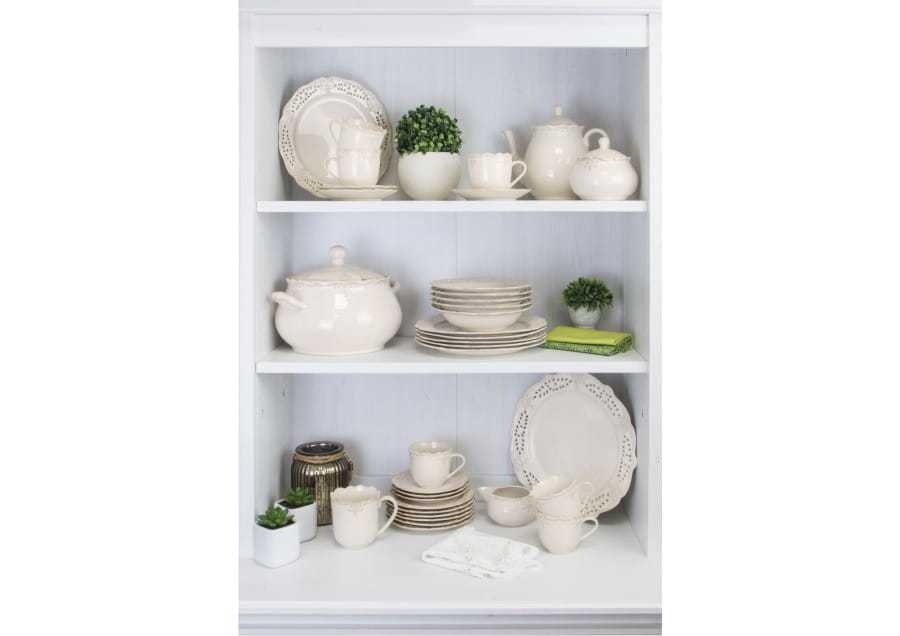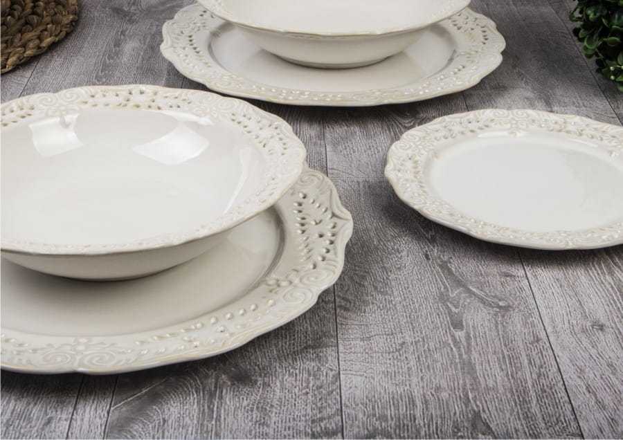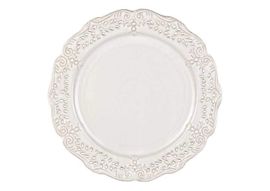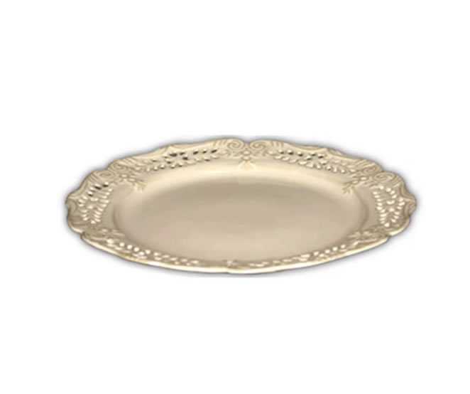 Mělký porcelánový talíř ze série Amelia s velmi decentním rustikálním potištěným vzorem vhodný pro slavnostní, ale i každodenní stolování.