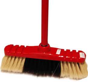 Metla s plastovým tělesem a syntetickými vlákny. Kovová hůl má plastový potah.