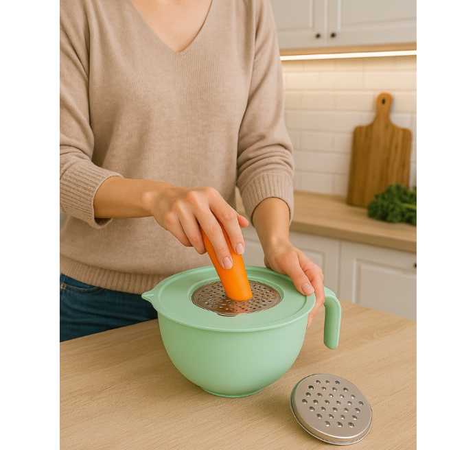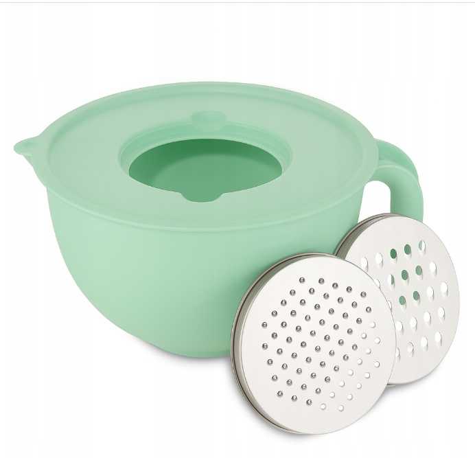Multifunkční nádoba je ideální pro přípravu čerstvých salátů, zeleninových placek nebo strouhání sýra přímo do nádoby. Díky vyměnitelným struhadlům se snadno přizpůsobí aktuálním potřebám. Miska má elegantní provedení v módní pastelové barvě, snadno se čistí i skladuje. Ocení ji všichni, kdo oceňují praktická řešení a efektivní práci v kuchyni.