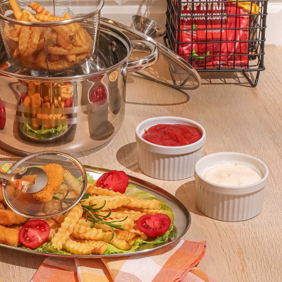 Při vaření můžete misku použít i na menší ingredience. Produkt je vyroben z trvanlivé, smaltované porcelánové keramiky. Je uzpůsoben pro bezpečné mytí v myčce nádobí a zapékání v troubě (max. 180 °C).