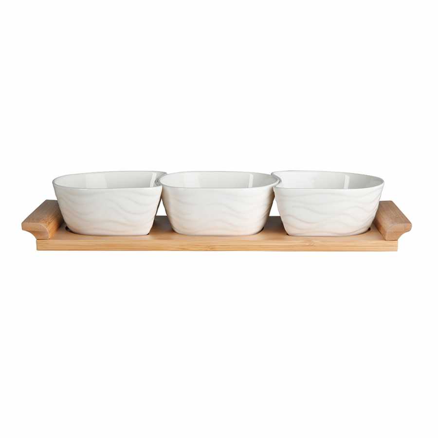 Misky sada 3ks na pochutiny Regular, které jsou uloženy na bambusové tácku, která tomu dodává celkovou eleganci. Misky jsou ideální pro servírování omáček, dipů a různých pochutin Design misek odpovídá nejnovějším trendům. Povrch misek je příjemný na dotek a snadno se čistí. Jsou vhodné do myčky i mikrovlnné trouby.