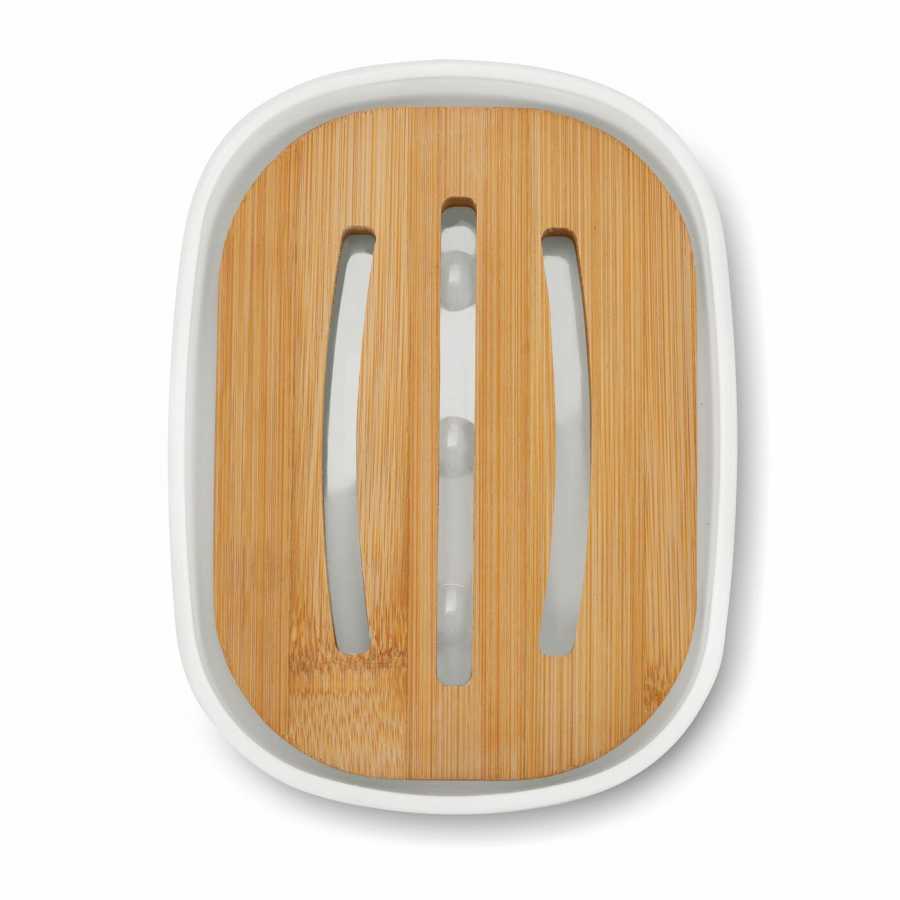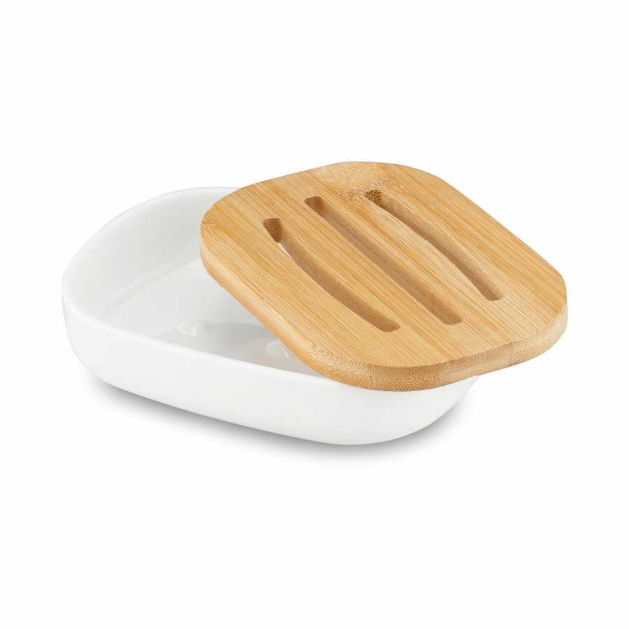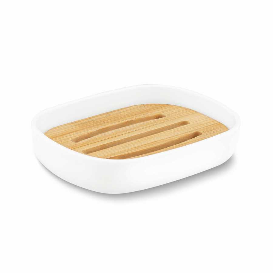 Bílá podložka pod mýdlo s bambusovým okapovačem umožňuje rychlé schnutí mýdla a snadné čištění. Univerzální design série Iver doplňuje koupelnové doplňky a stabilně stojí na umyvadle či vaně.