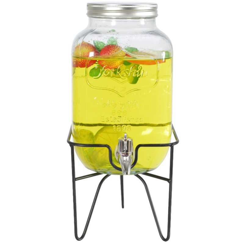 Skleněná nádoba s drátěným stojanem je vhodná pro servírování osvěžujících nápojů na letních párty a oslavách. Nádoba je doplněna víkem a kohoutkem v elegantním černém provedení. Těsný uzávěr chrání obsah před hmyzem a nečistotami.