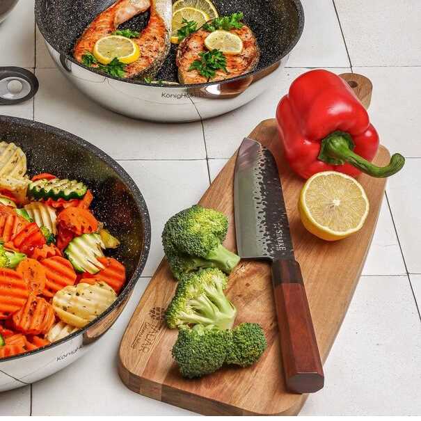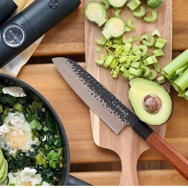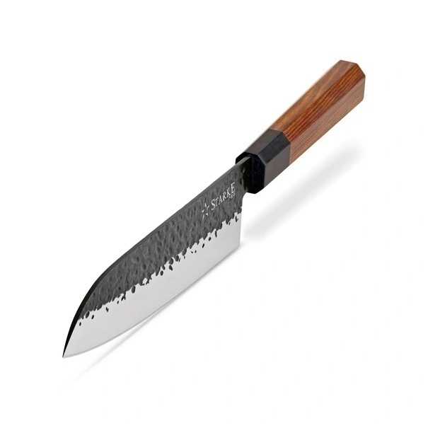 Tento ručně vyráběný Santoku nůž Starke Pro 18 cm s vysokou kvalitou vám umožní efektivnější přípravu jídel. Kolekce ručně vyráběných čepelí Toshiro je ideální volbou do domácí kuchyně. Rukojeť je vyrobena z kombinace hebanu a růžového dřeva, což vytváří stylový vzhled, zejména ve spojení s čepelí zdobenou efektem kovového kladívka.