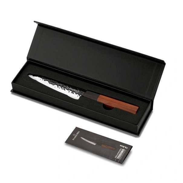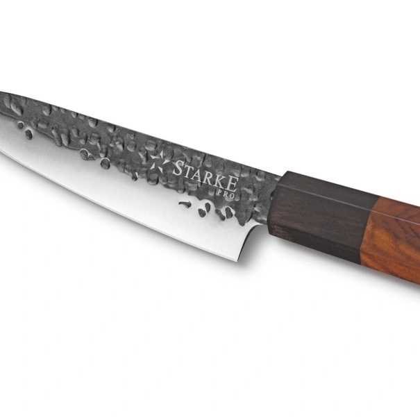 Tento ručně vyráběný univerzální nůž Starke Pro 12,5 cm s vysokou kvalitou vám umožní efektivnější přípravu jídel. Kolekce ručně vyráběných čepelí Toshiro je ideální volbou do domácí kuchyně. Rukojeť je vyrobena z kombinace hebanu a růžového dřeva, což vytváří stylový vzhled, zejména ve spojení s čepelí zdobenou efektem kovového kladívka.