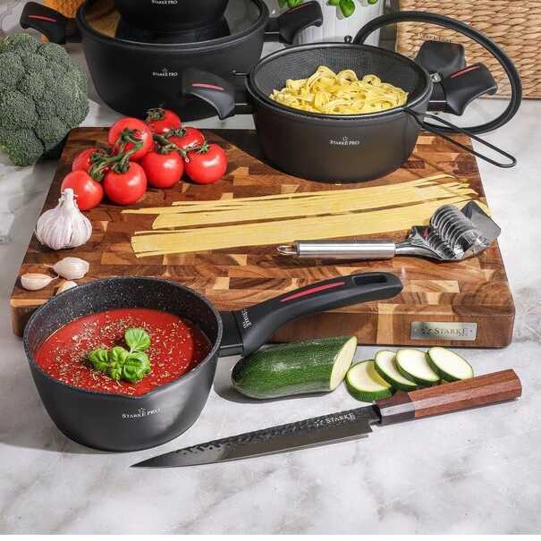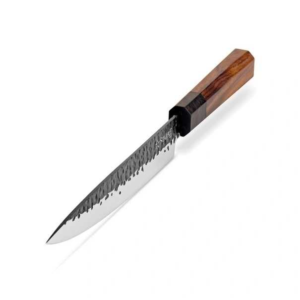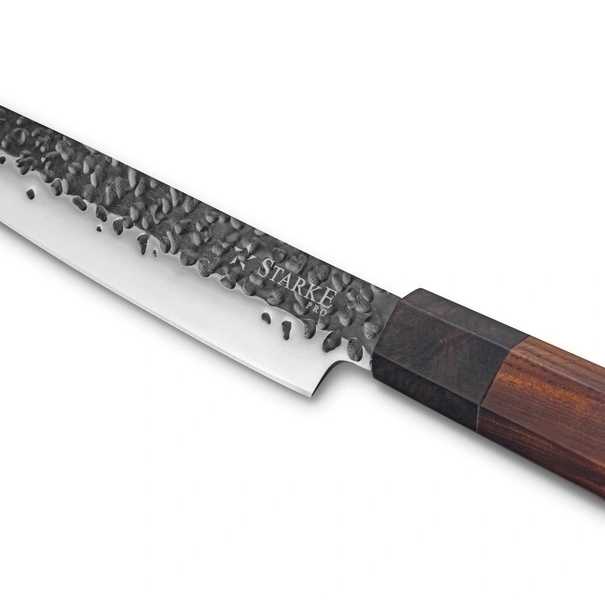 Tento ručně vyráběný univerzální nůž Starke Pro 20 cm s vysokou kvalitou vám umožní efektivnější přípravu jídel. Kolekce ručně vyráběných čepelí Toshiro je ideální volbou do domácí kuchyně. Rukojeť je vyrobena z kombinace hebanu a růžového dřeva, což vytváří stylový vzhled, zejména ve spojení s čepelí zdobenou efektem kovového kladívka.