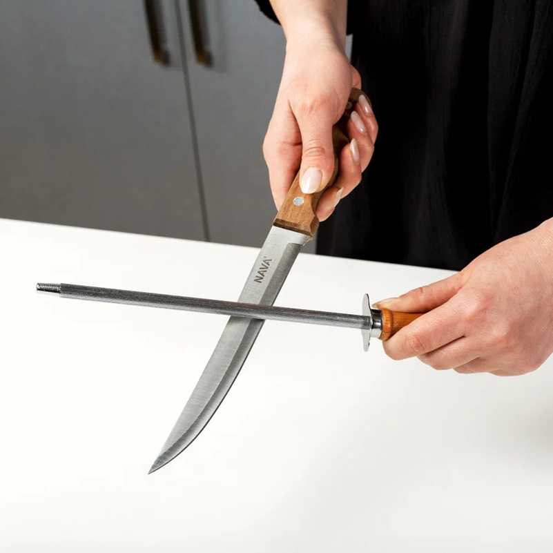 Ostřič nožů v této verzi připomíná troška meč. Je to ocelová tyčka s drsným, speciálním povrchem. Díky tomu nože získají původní ostrost řezání. Parametry ostřiče nožů 30,5 cm Proč koupit ocielku Ostřič nožů je praktická pomůcka, protože místo nákupu nového nože mu dává nový život. Profilovaná pohodlná rukojeť umožňuje při ostření pracovat efektivně, rychle a bezpečně. Rukojeť je zakončena ocelovým věšákem, který umožňuje zavěsit jej kdekoli na dosah ruky. Je vyroben z nerezavějící oceli. To znamená, že je mimořádně odolný vůči poškození nebo vlhkosti. Problém s tupými noži nebo nůžkami bude vyřešen jednou provždy.