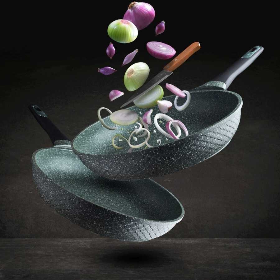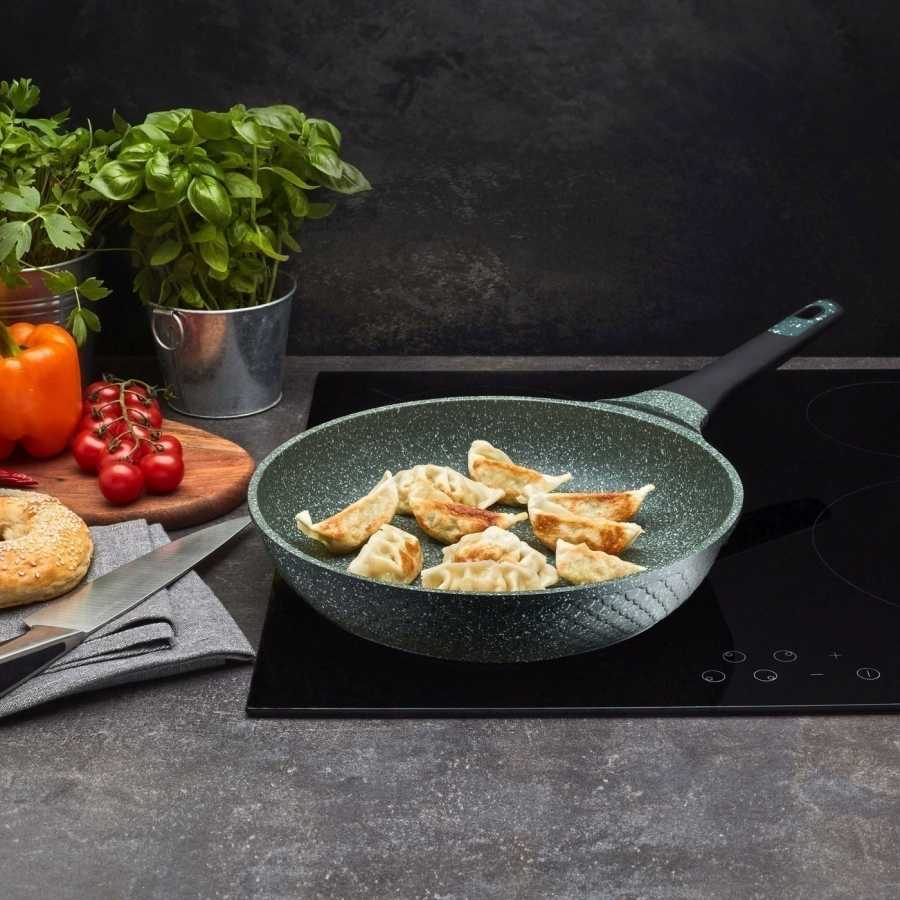 | Další informace | hliníková odlévaná pánev s 3-vrstvou vrstvou Greblon C3 Granite, non-stick technologie s nízkou adhezí, PFOA free, soft touch rukojeť s otvorem pro věšení, přišroubovaná, výška okraje 5,5 cm |