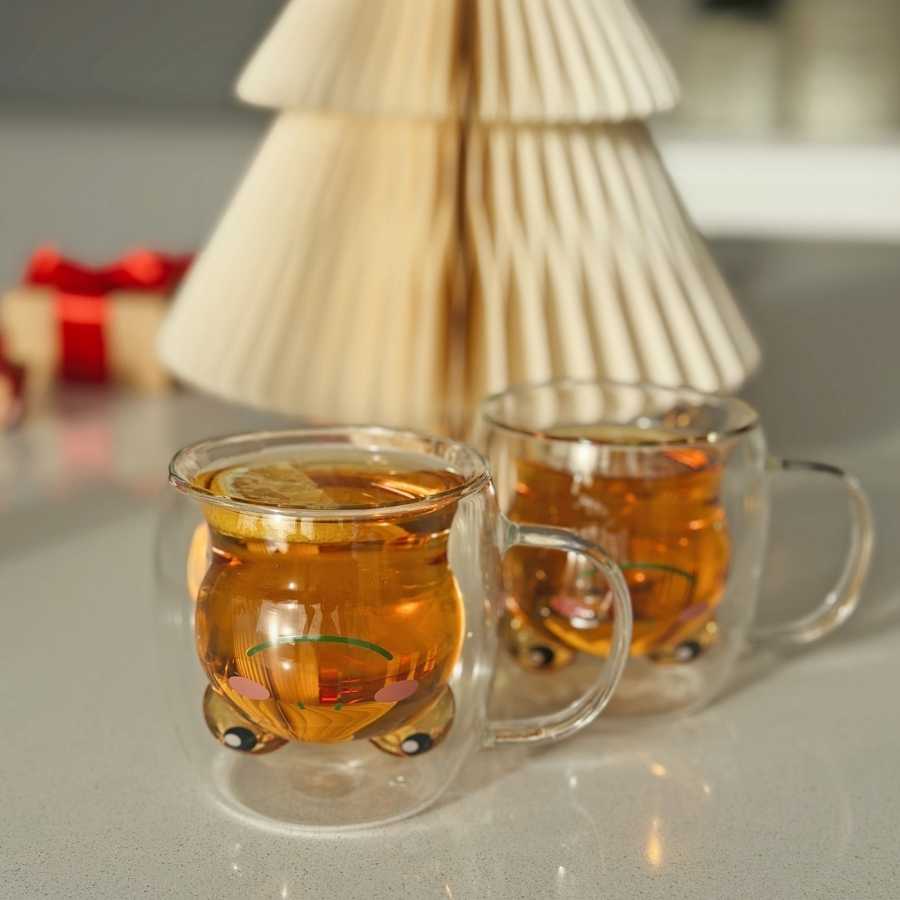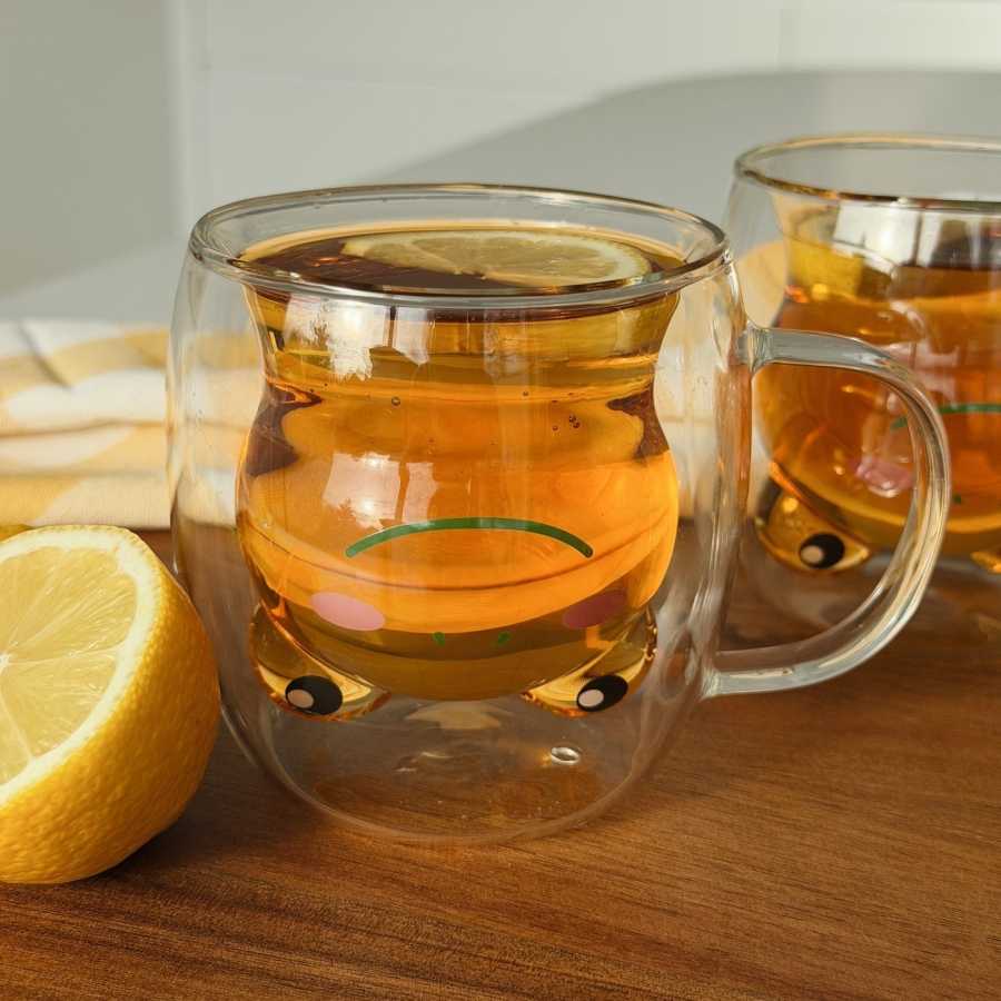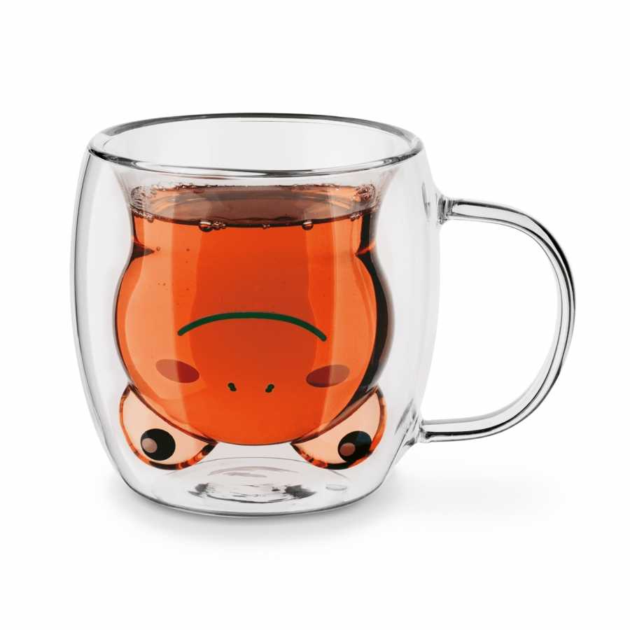 Zábavná sklenice s dvojitou stěnou vytváří efekt nápoje „visícího ve vzduchu“ ve tvaru hlavičky žabky. Borosilikátové sklo chrání ruce před popálením a odolává šoku tepla do 100 °C.