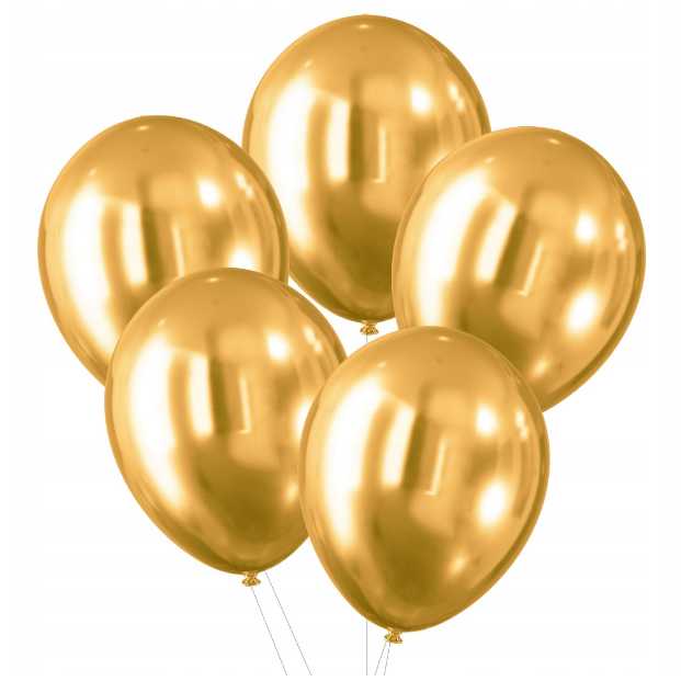 Elegantní set 5 zlatých chromových balónů Arpex Celebrate! o průměru 30 cm dodá vaší párty luxusní metalický lesk. Vhodné pro narozeniny, firemní oslavy, svatby či silvestrovské večírky – naplníte je vzduchem nebo heliem.