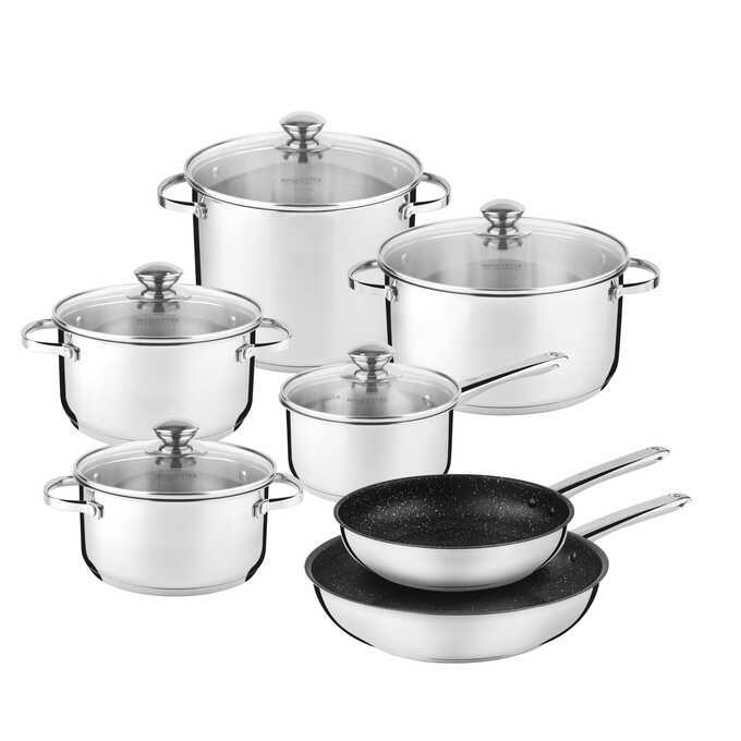 Sada hrnců z nerezové oceli mají odpovídající skleněné poklice vybaveny parními průduchy, vhodné pro všechny sporáky: keramické, plynové, elektrické a indukční. Šikovné rukojeti z nerezavějící oceli, nýtované, uvnitř hrnců je litrová stupnice. Pánve Jsou pokryty nepřilnavým povlakem černé barvy, skvrnité.
