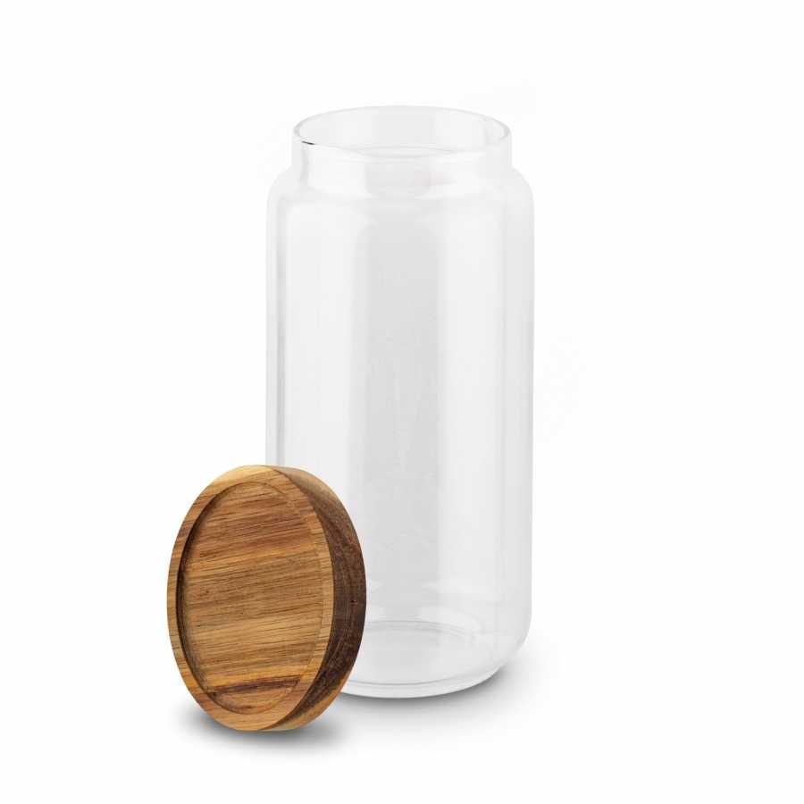 Borosilikátová skleněná nádoba s víčkem z akáciového dřeva je ideální pro suché a sypké suroviny jako mouka či koření. Průhledný design umožňuje kontrolu obsahu bez otevření, chrání před vysycháním a nečistotami.