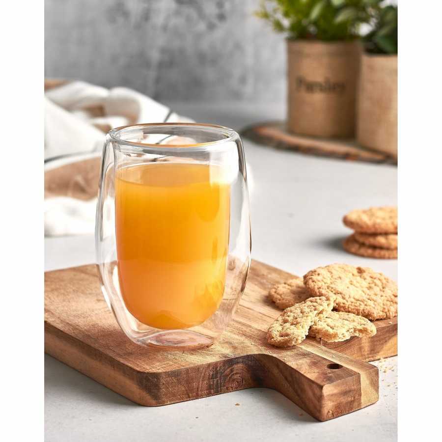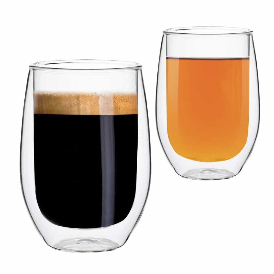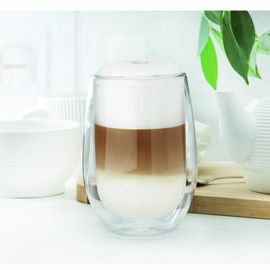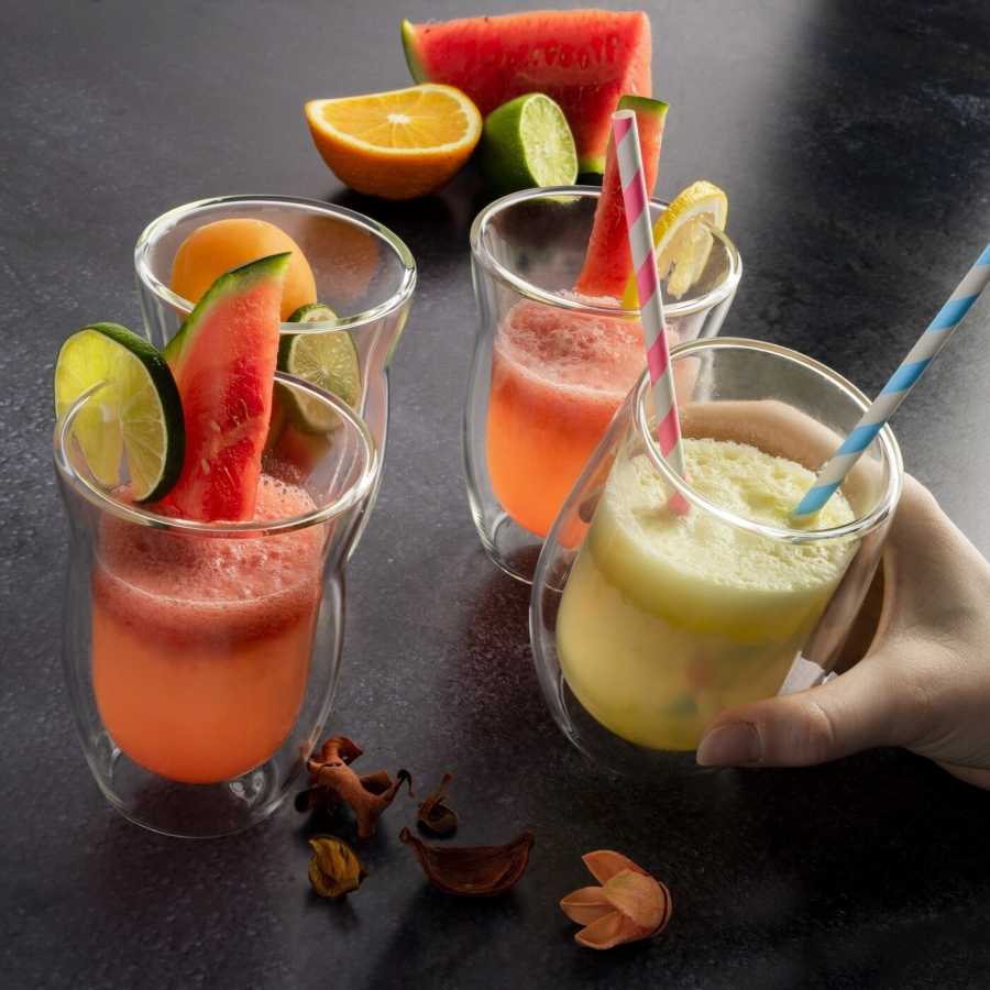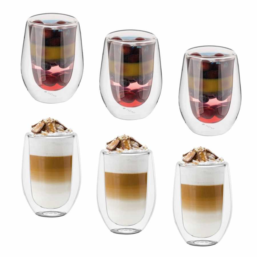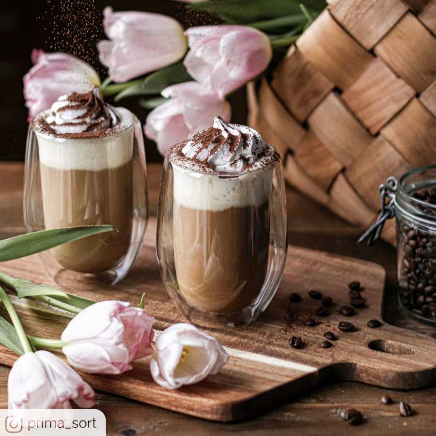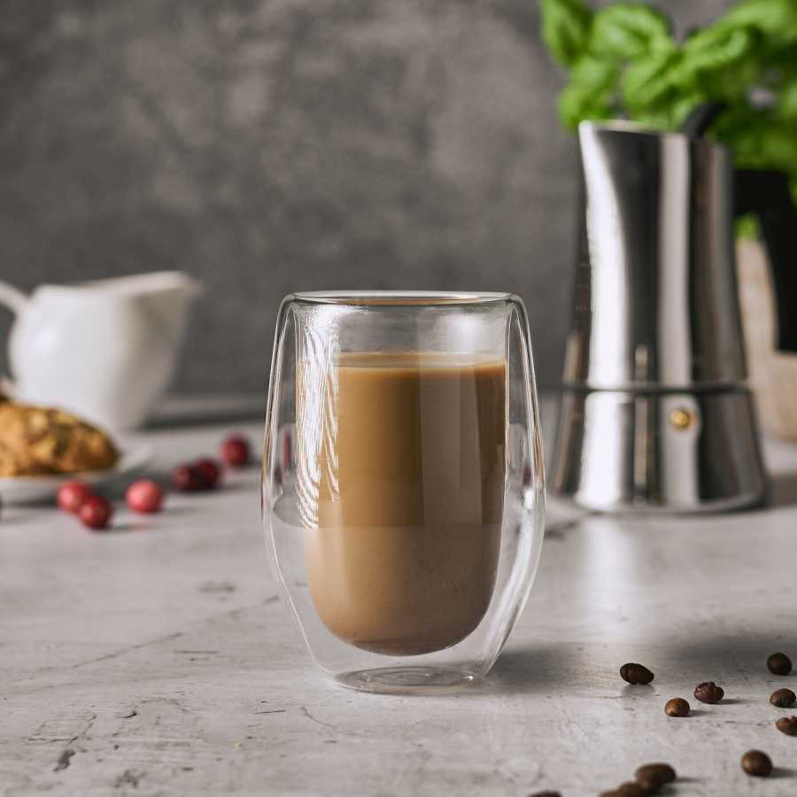 Sklenice s dvojitou stěnou z borosilikátového skla udrží kávu horkou déle bez rizika popálení ruky. Průhlednost zvýrazňuje vrstvy v kávě, lattě či dezertních nápojích.